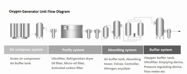 (See following flow Chart) The raw air compressed by compressor into the purification system to remove large amount of oil and water, then into PSA oxygen generator system for nitrogen removal, the oxygen then into the oxygen buffer tank and then pressurized by the oxygen booster to rated pressure for preparation of final oxygen package device, package row have two lines, one in work, the other is standby to ensure a continuous package work.